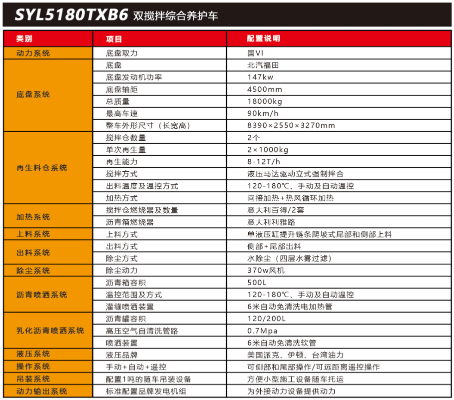 SYL5180TXB6 雙攪拌路面綜合養(yǎng)護車是一款集現(xiàn)場生產(chǎn)新瀝青混合料、瀝青路面冷 料、舊料、銑刨料 100%現(xiàn)場加熱再生利用,熱瀝青灑布、裂紋跟蹤灌縫、乳化瀝青噴灑、 為其他裝置提供電力和液壓動力等多種功能于一體的瀝青路面熱再生綜合養(yǎng)護車??蓪崿F(xiàn) 多場合、多路面的各種類養(yǎng)護作業(yè) ,養(yǎng)護修補費用低 ,作業(yè)快捷 ,高效率、節(jié)能環(huán)保性能突出等特點。適用于多種路況的中大施工量和高速公路的修補施工。
